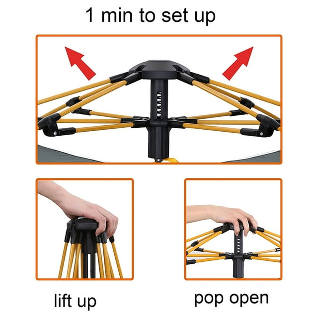 - ✔ Installation free: An automatic pop-up switch allows you to open the tent within three seconds. Just gently lift up and pop up the top mechanism downward, and the tent will open automatically. It is very simple and saves time.