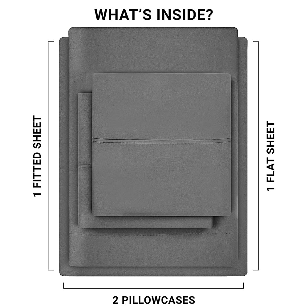 - BED SHEET SET - Queen size 4-piece bed sheets set comprising of 1 flat sheet measuring 90 by 102 inches with a 2 inches self-hem, 1 fitted sheet measuring 60 by 80 inches and 2 pillowcases measuring 20 by 30 inches each with a 4 inches hem