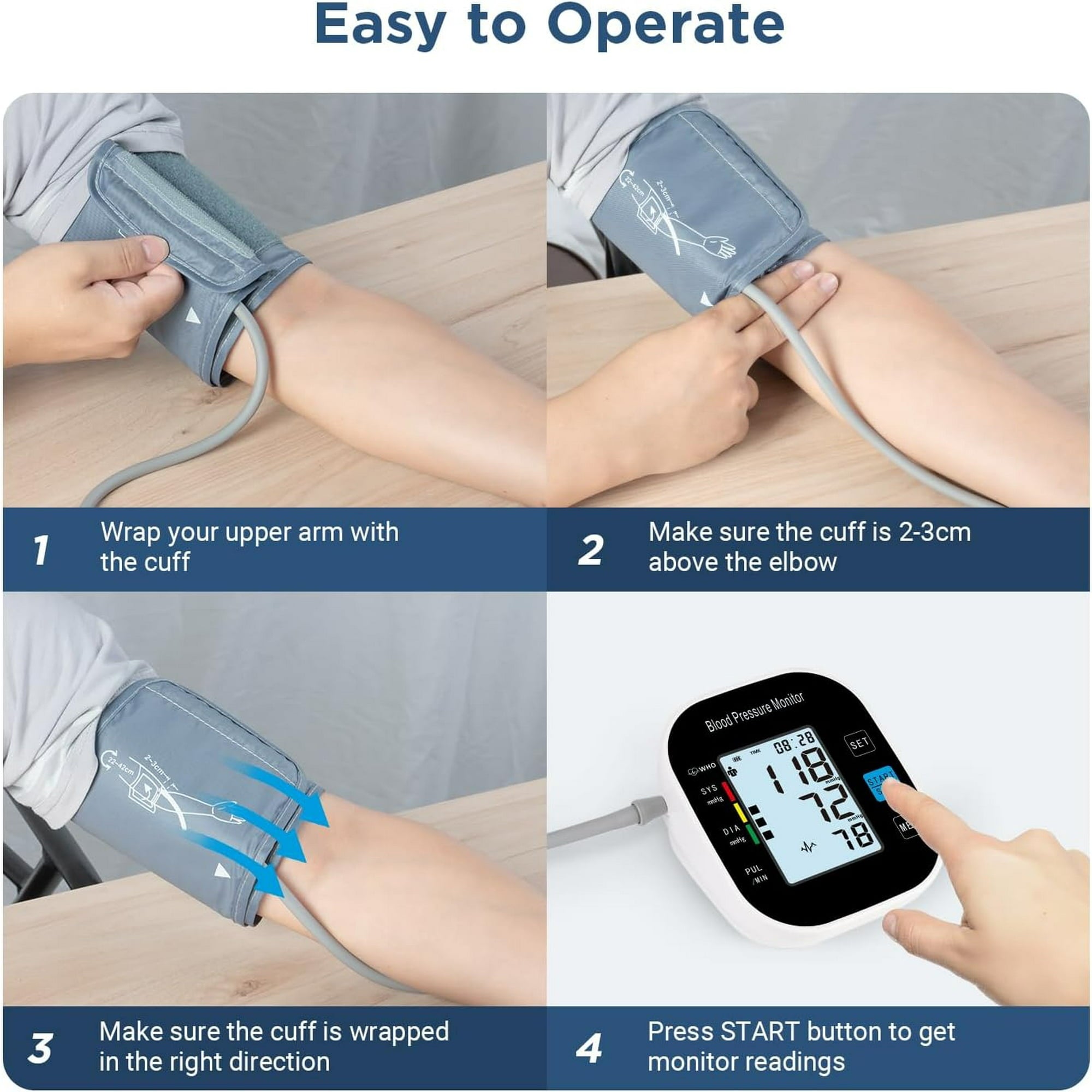 - Improper Cuff Wrapping Display - This blood pressure monitor not only measures your blood pressure accurately but also comes with an intelligent system that can detect irregular heart rate and prompt you to adjust the cuff placement for accurate readings.