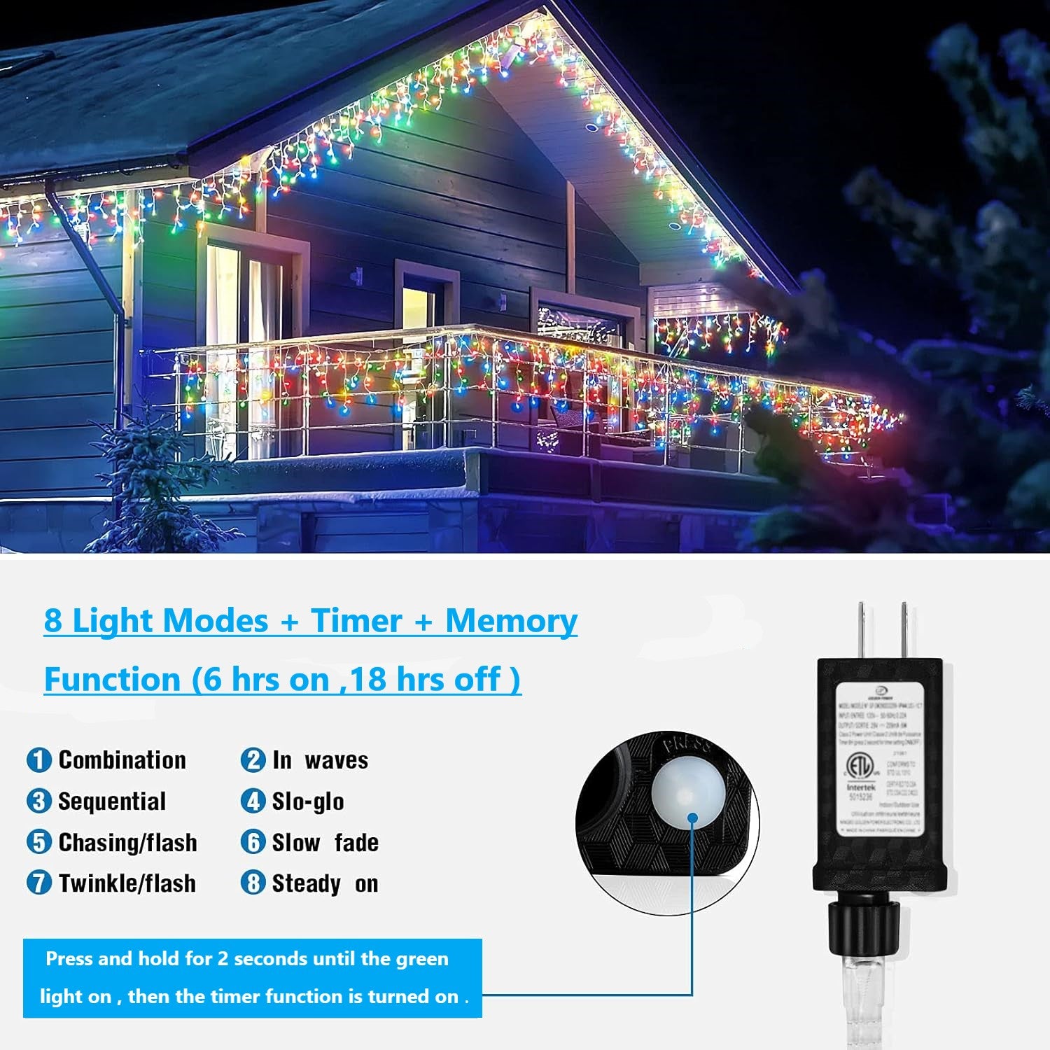 8 modes of LED icicle light: The led icicle string lights come with 8 modes: combination, in waves, sequential, slogs, chasing/flash, slow fade, twinkle/flash, and steady on. The different lighting effects are controlled by buttons on the plug. These beautiful and vibrant outdoor icicle lights will bring you a strong holiday atmosphere.