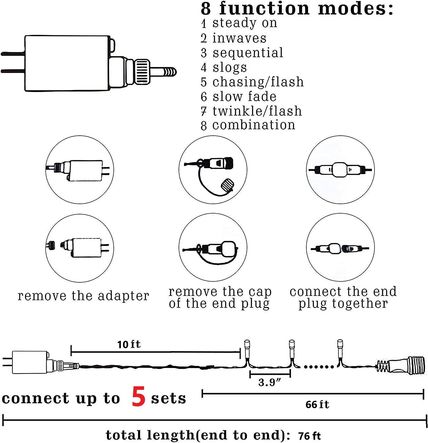 - ✨8 Lighting Modes: Simply by pressing the button on the controller, you can change up to 8 lighting modes, including Combination, In Waves, Sequential, Slo-Glo, Chasing/Flash, Slow Fade, Twinkle/Flash, and Steady on.
