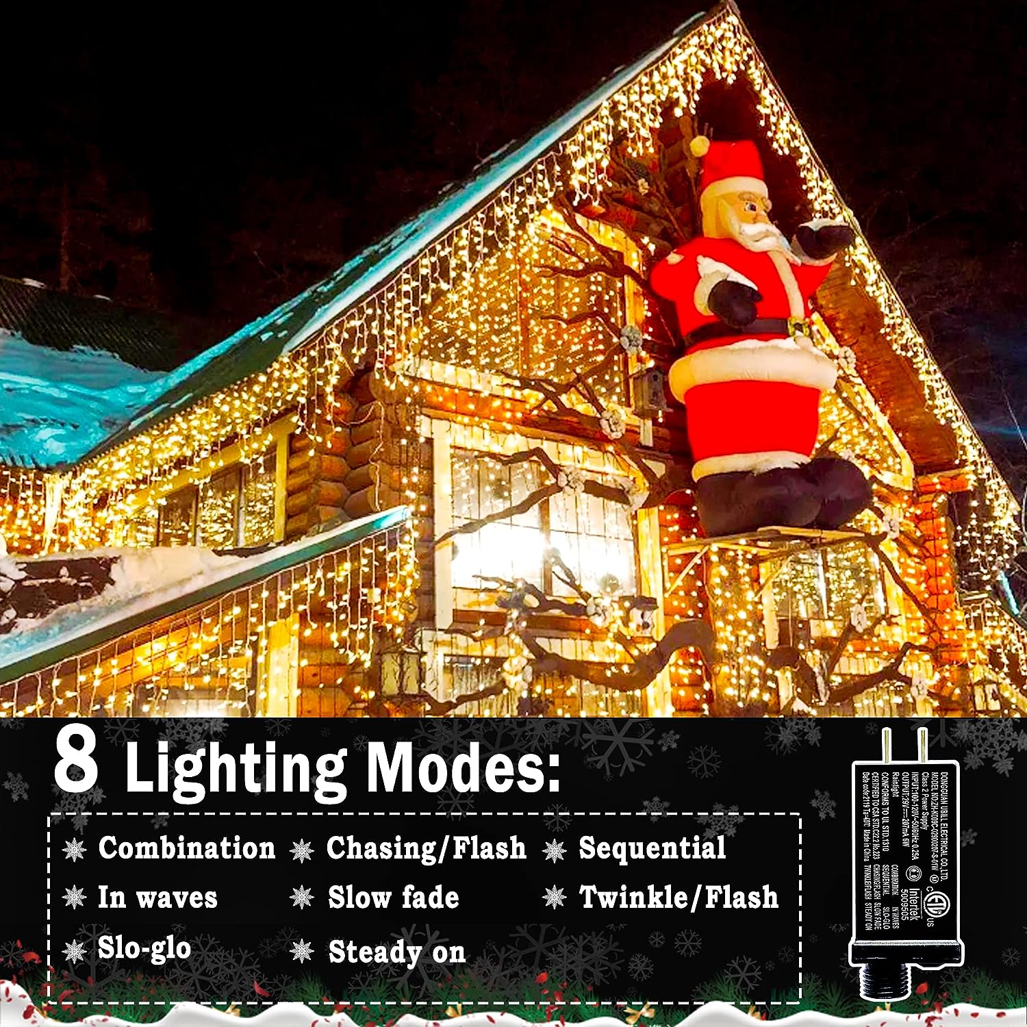 - 【8 Lighting Modes & Waterproof】Our Christmas decorations outside lights are available in a 8 lighting modes: Combination,In Waves,Sequential,Slo-Glo,Chasing/Flash,Slow Fade,Twinkle/Flash and steady on. IP44 outdoor waterproof designed, which is very perfect for outdoor decor and can work normally even in cold winter. This is the most classic style, lighting along the eave, deck, balcony, stairs, fence, creates a charming atmosphere.
