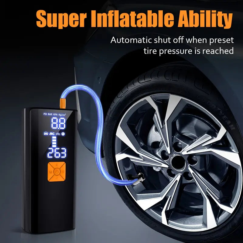 A versatile air pump that serves as a portable tire inflator, features 2 LED lights for night illumination and SOS alarm, and functions as emergency lighting and warning signals. Additionally, it includes a 5V/2A USB output port on the top for charging mobile phones or other electronic devices, serving as an emergency power source.