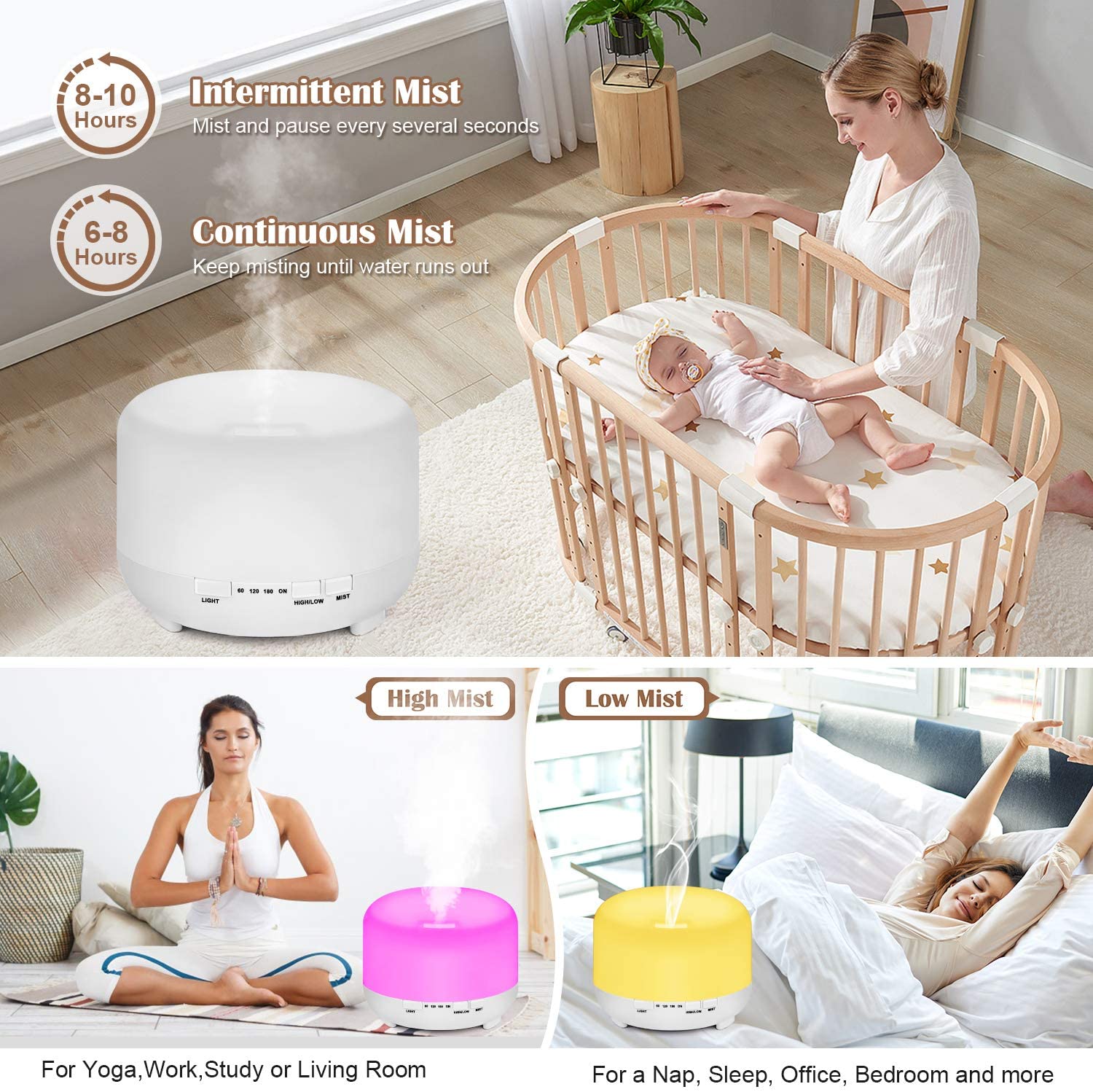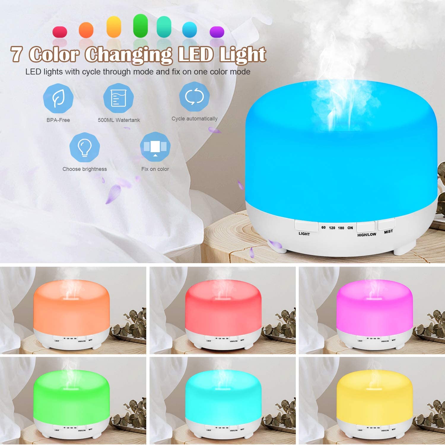 - 【7-Color Changing LED Lights】Each color of the 7 smoothing LED lights has 2 light options, dim & bright. You can cycle it through 14 colors, or set it to fix on one color to meet your different needs. This aroma diffuser with bright colorful lights is the perfect decor and night light for your living room and bedroom. In addition, you can turn off the lights when sleep.