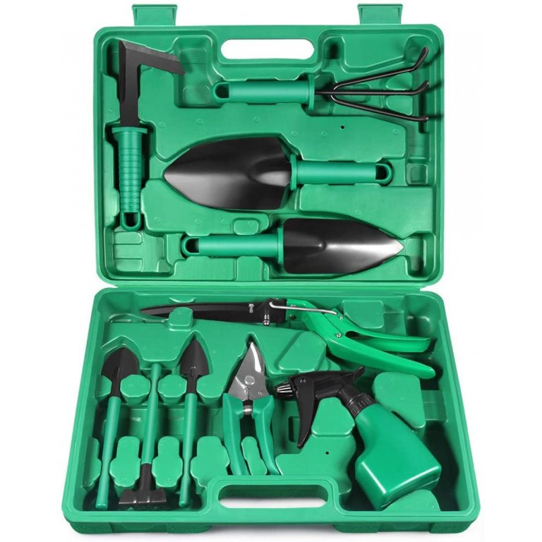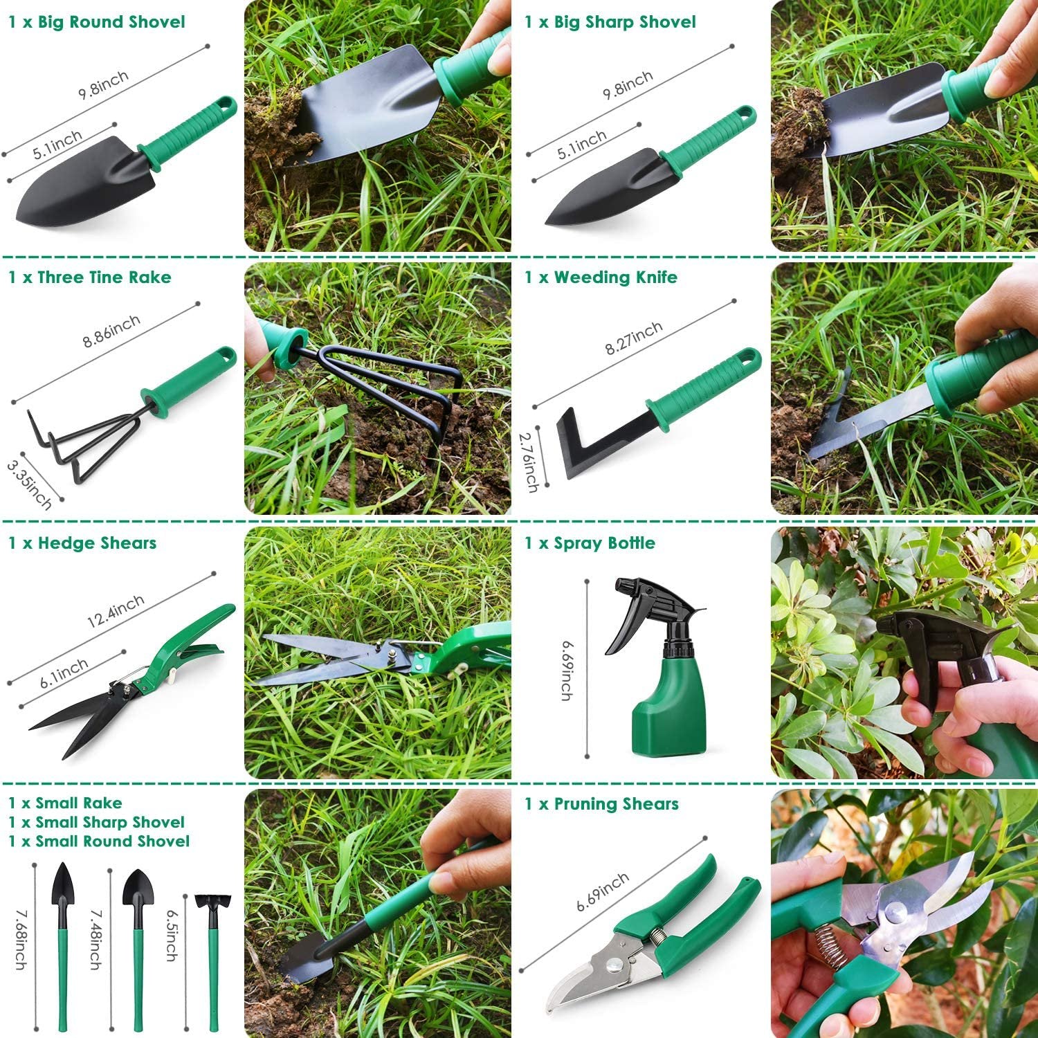 ★【Indispensable Garden Tool Set】★10 in 1 garden tool set, including 1 x three tine rake, 1 x large round shovel, 1 x large tip shovel, 1 x moss shovel, 1 x small round shovel, 1 x small tip shovel, 1 x small rake, 1 x pruning shear, 1 x spray bottle, 1 x hedge shear. One piece, with a slotted molded case toolbox, easy to store and carry.