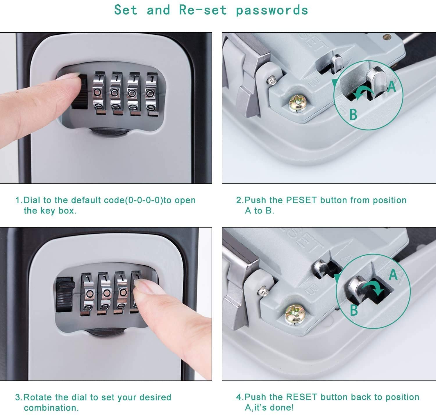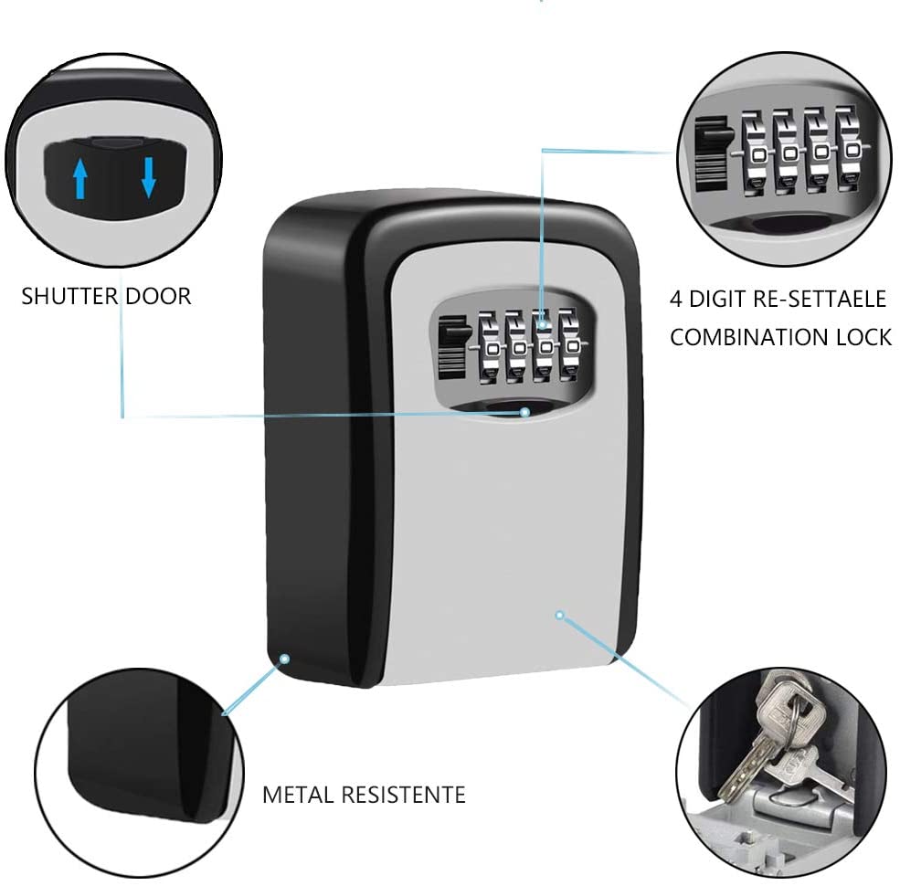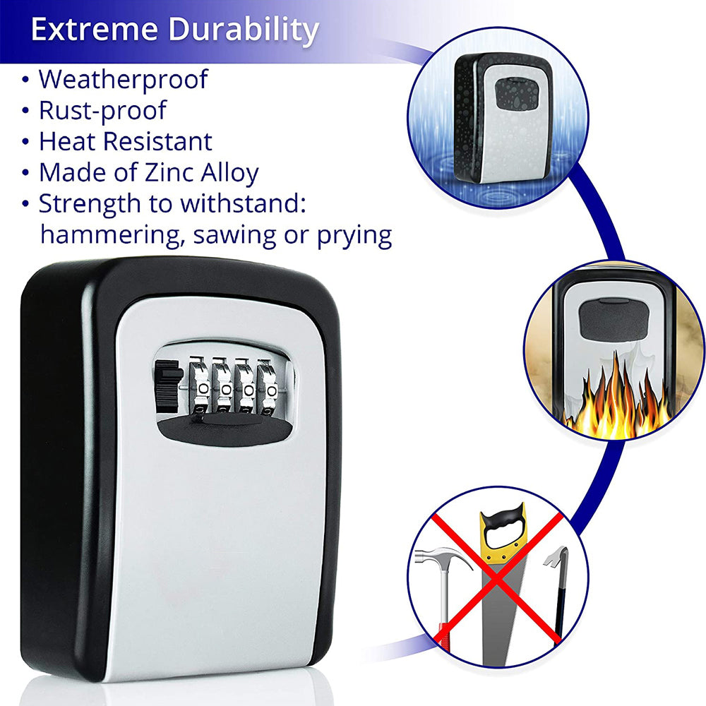 【High Security】: The 4-digit combination lock box allows you to set your own combo code with 10000 unique choices which you know it is secure. High strength zinc alloy body construction mounted inside with 4 heavy duty mounting screws, protects the key safe box from hammering, sawing and prying.