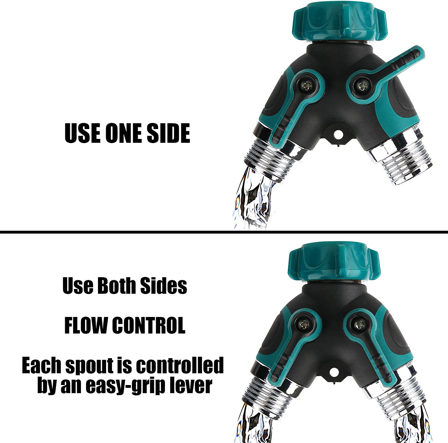 - 【Unique Design】3/4'' US standard size 2 way 'Y' hose splitter, 2 connectors & valves easily convert a spigot into 2 high flow water sources. Durable Construction, heavy duty zinc alloy, with long easy gripping handles for better control of the water flow. 360° allowing you to pull hoses in all directions.