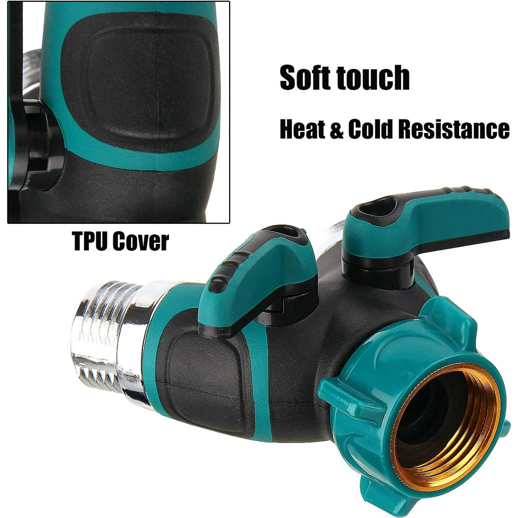 - 【Seamless Installation, Smooth Operation】The 2 way garden hose splitter has long handles (4 cm) which allow for smooth and easy shut on and off. Because the splitter is coated with rubber, it is ideal for stiff hands or hands with arthritis. Other than a basic understanding of how spigots and hoses work, no tools are needed, ensuring an easy and flawless installation. The water hose splitter is also able to rotate 360 degrees, allowing you to tug and pull hoses in all directions.