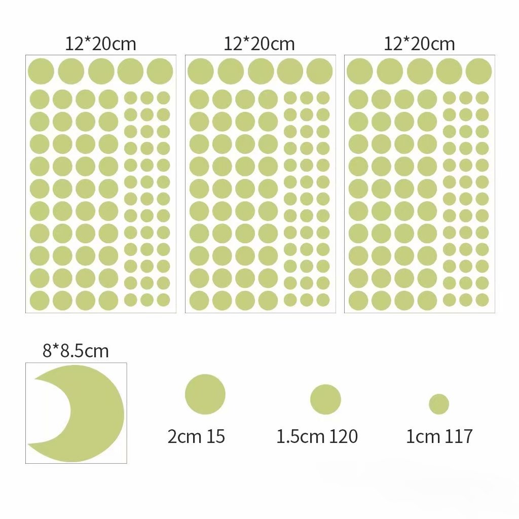 Include: 15 x Dia 20mm Circles; 120 x Dia 15mm Circles; 117 x 10mm Circles; 2 x Moon;40 x 22*21mm stars;63 x 15*15mm stars;4 x meteors