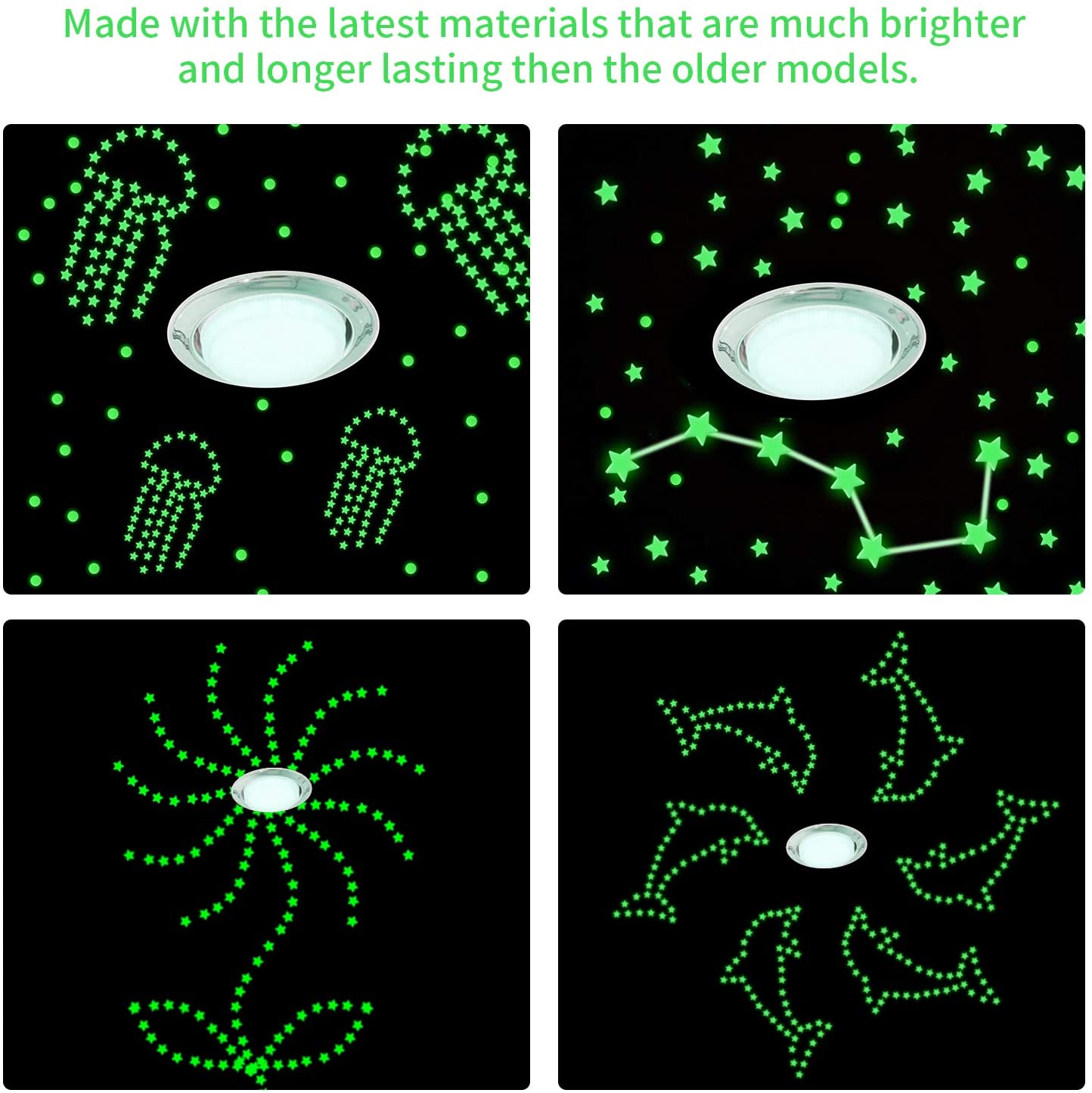 1,Glow dot,star,meteor, moon only glow in the dark when absorbed natural light or artificial light.