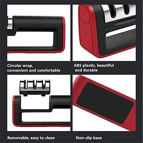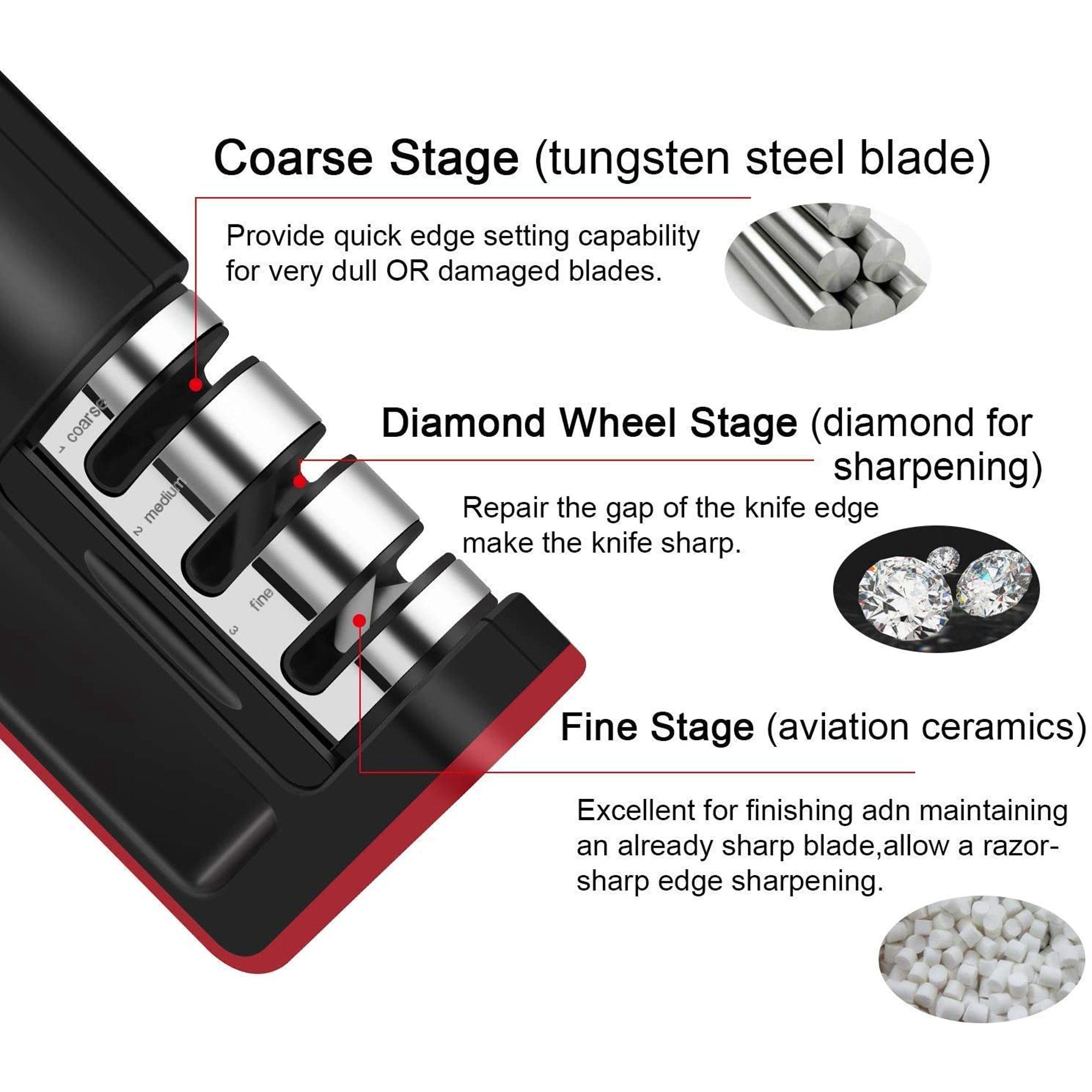 Each time you bring the knife through the sharpener, you won’t just pull it straight through. Instead, follow the curve of the knife so that the handle comes up and is higher at the end than it was at the beginning. So the entirety of the blade will get sharpened.