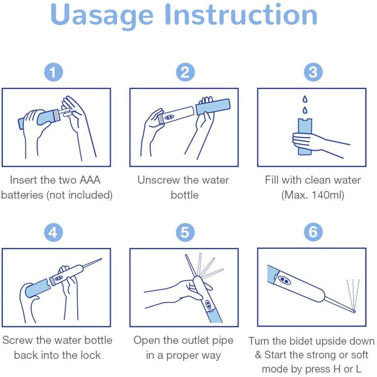 - 【Electric Bidet】Turn the battery cover counterclockwise,open the battery compartment, and add two AAA batteries.add water to the 140ml cup, and tighten it for use. The transparent cup allows you to clearly see how much water is left, making it easy to add water in time.