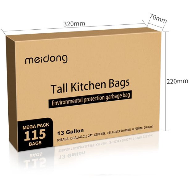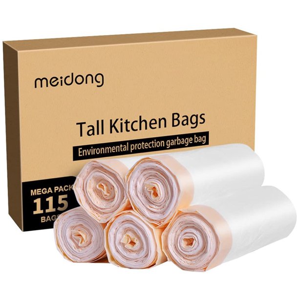 Trash Bags 13 Gal Extra Strong White Bio-degradable garbage bag Meidong trash bags are super thick for holding messy in your office, your kitchen, and even your yard, designed for preventing rips and tears. These 13-gallon garbage bags are easy to stretch over the rim of the garbage can. Very useful in your daily life. Meidong Trash Bags 13 Gallon Bags are made of sturdy material, designed to handle the garbage in your office and your home. Bags are packed in rolls, 115 counts in total. Strong and Durable Drawstring Handles Durable drawstrings with thickened design help tie and lifts the trash bag with one quick pull. Easy to open and close. Entirely Scent-Free Trash Bags The trash bags have no plastic or strong scent. Refreshing your office and kitchen scent. Good for those who don't like strong fragrances. Super thick and Extra Strong Greater capacity to hold more and heavier garbage. Extra strong garbage bags provide twice the stretchable strength of typical trash bags. Stretch well The trash bags stretch well and resist tears and leaks. The tall kitchen garbage bags fit and stretch around your trash can without sliding into the can. Keep your living room clean this unscented garbage is clean and environmental-friendly. Enjoy your time with your family and enjoy using Meidong trash bags.