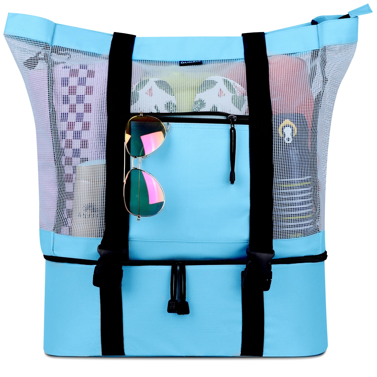 【INCREDIBLE SPACE, SUPER HANDY】 The mesh bag on top with a zipper closure helps you get stuff quickly. Special - made PVC mesh which is anti - sticky keeps items dry and odor-free, just shake it and the sand shall leave your sight. With a 12 can capacity insulated cooler bag on bottom and a 4 big towels capacity mesh storage bag on top, our pool bag shall never let you down