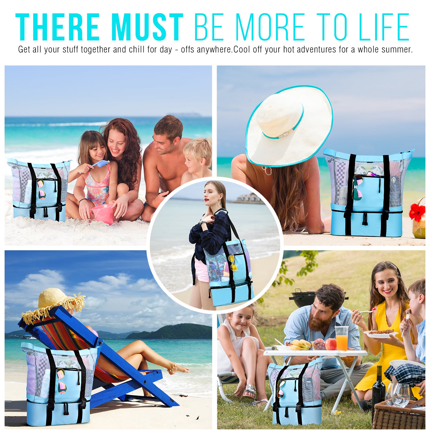 【GET READY FOR A FUN DAY OFF】 Need a break from work? Our mesh beach tote bag helps you get ready for picnics, barbecues, camping, Swimming, road trips, vacations, festivals, tours and sporting events, family outings, all kinds of parties and more. Not only cans of frosty beer or lunch basket, also side pockets to hold most of your sunscreen, phones, sunglasses and more