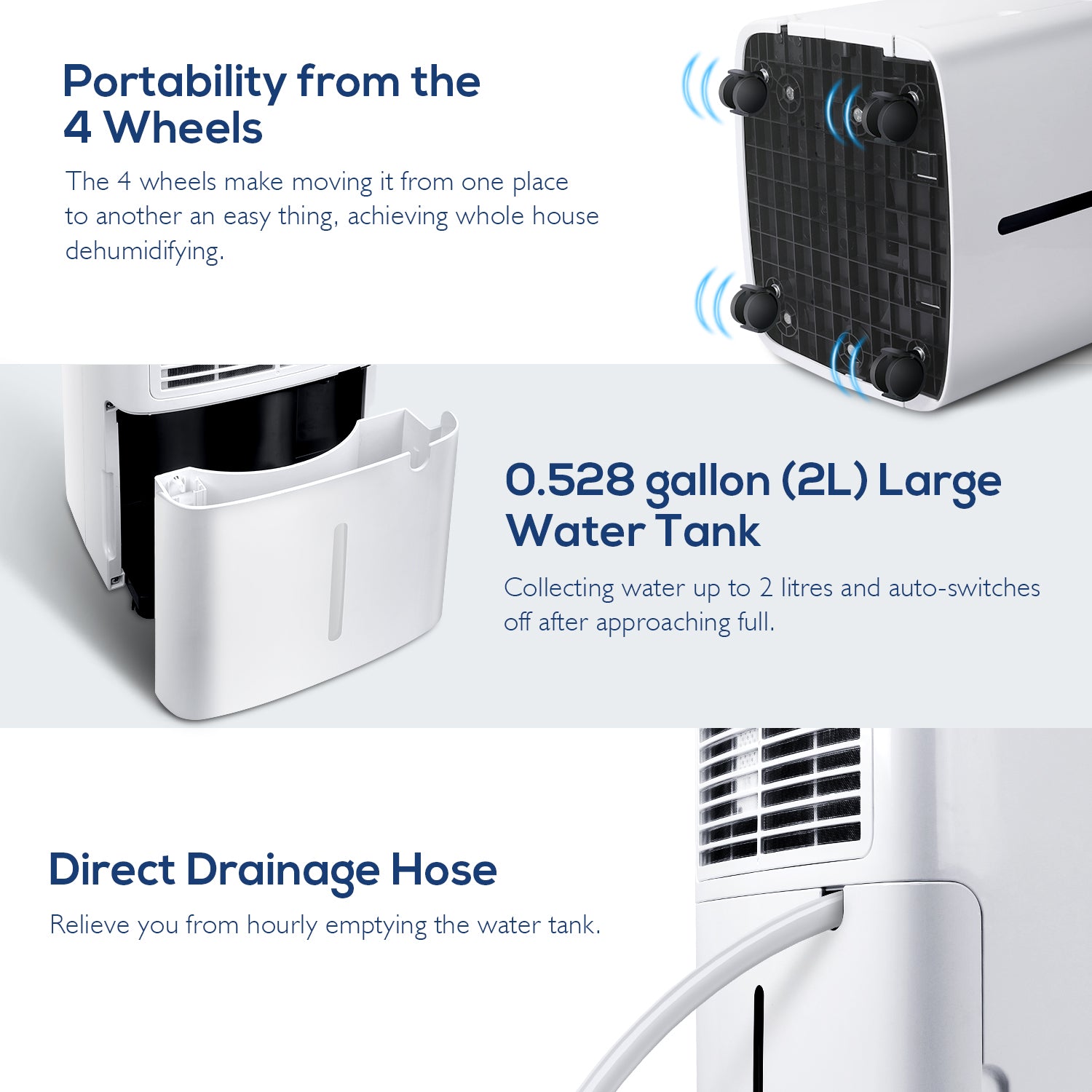 - 【2L Water Tank & Drainage Pipe】 Apart from a 2L large capacity water tank that auto turns off when approaching full, the dehumidifier also comes with a drainage hose that enables it to dewater directly, making dehumidifying a snap whether for bedroom, basement, RV, or office.