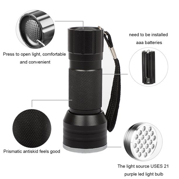 AAA Standard Alkaline Battery (Not Included), Voltage: 4.5V (Rechargeable battery is not recommended!). 21 UV LED allows covering a larger area. Perfect for outside use such as hunting scorpions and minerals! Not work well on cat urine. UV Flashlight well-made with high-quality aluminum alloy, make it strong, durable, and long-lasting. Engineered enhanced LED bulbs which are 30% Brighter than other lights.